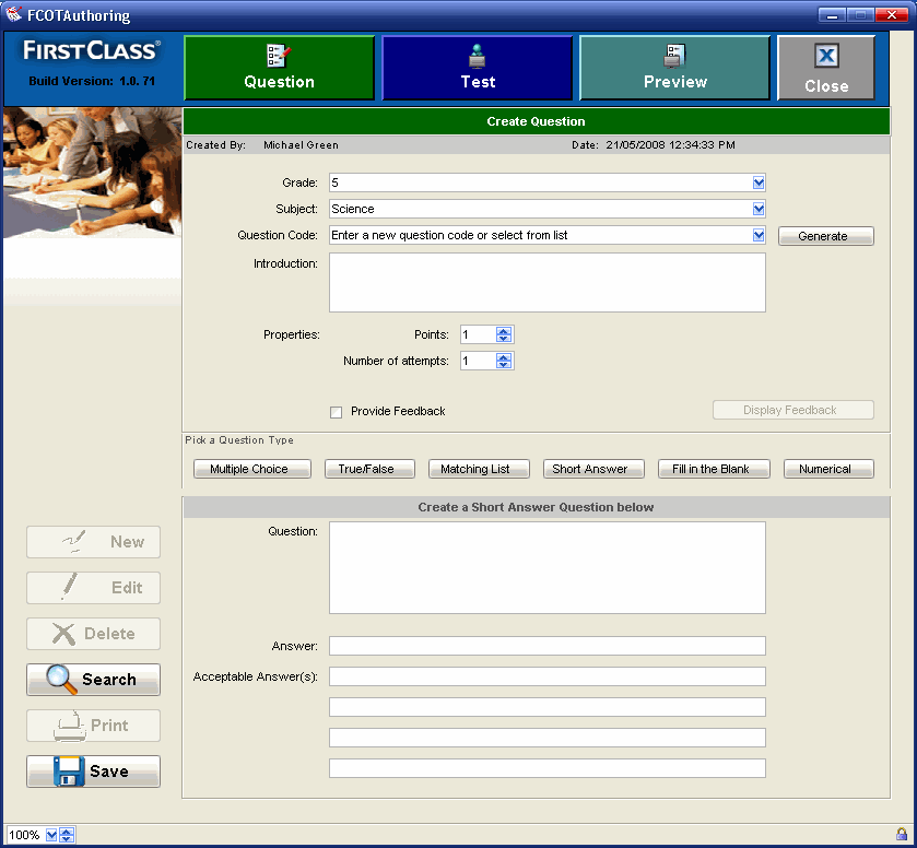 The Authoring tool supports the creation of multiple choice, matching list, true/false, numeric, fill-in-the-blank, and short answer question types that are saved into a question bank.